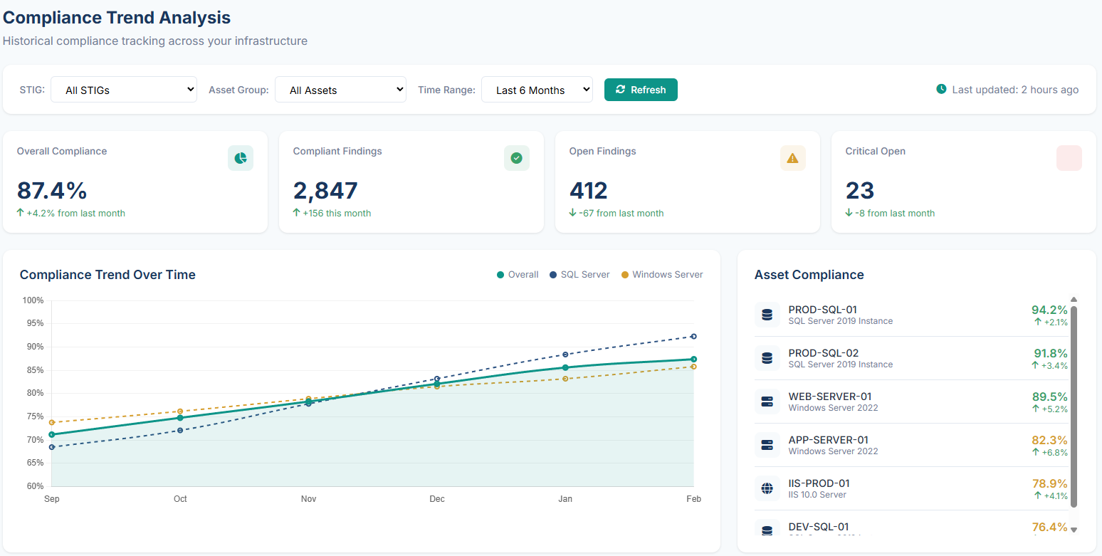 Purpose-built by a former Microsoft Architect and STIG expert. Reduce compliance effort by 90% with automated scanning, centralized management, and audit-ready reporting for Windows environments with a heavy focus on SQL Server.