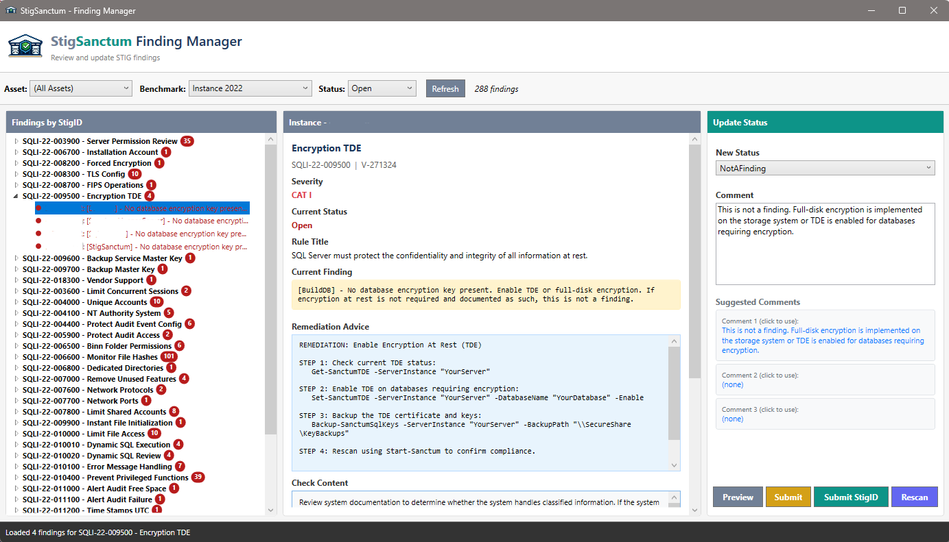 Free solutions require you to interpret DISA requirements yourself. With StigSanctum, you get built in Remediation Advice summarizes, and scripting tools. Even better, optionally direct access to the expert who helped write the SQL STIGs - meaning you understand not just what the requirement is, but why it exists and the best way to implement it.